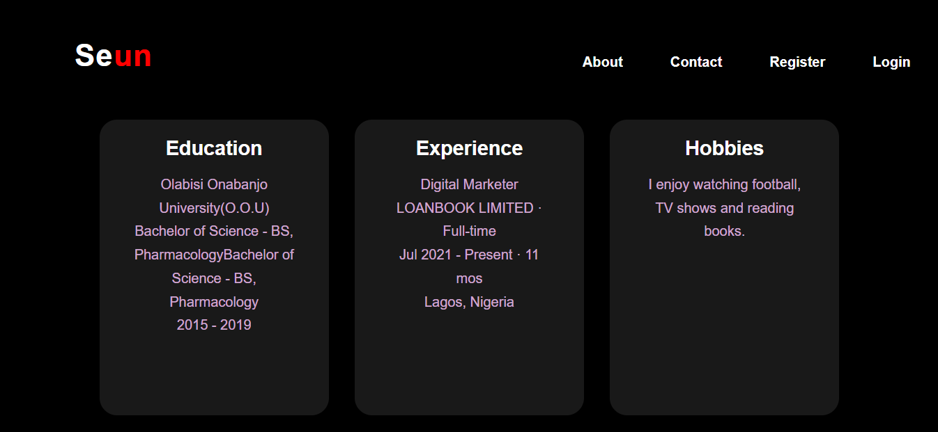 An HTML page featuring an about me page, a contact page, a register page and a login page. We were given some parameters to incorporate into each page.